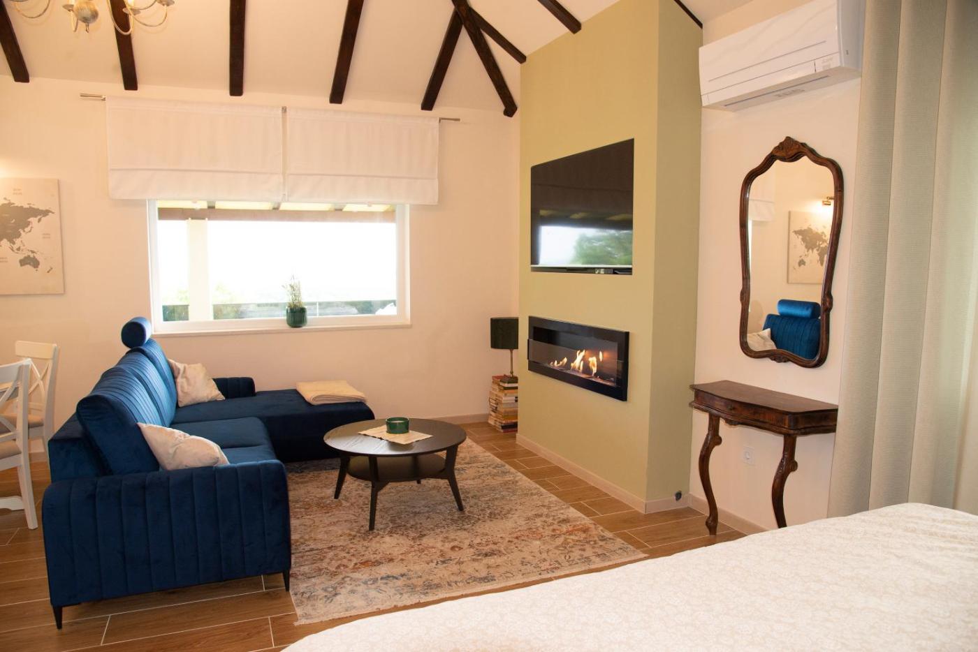 Studio Apartment. Guests will have a special experience as this apartment features a fireplace. Featuring a private entrance, this air-conditioned apartment is comprised of 1 living room, 1 separate bedroom and 1 bathroom with a shower and a hairdryer. Guests will find a stovetop, a refrigerator, kitchenware and an electric kettle in the well-fitted kitchen. The apartment also has a barbecue. Boasting a terrace with lake views, this apartment also offers a seating area and a flat-screen TV with cable channels. The unit offers 5 beds. ;